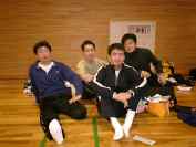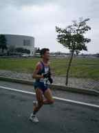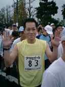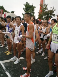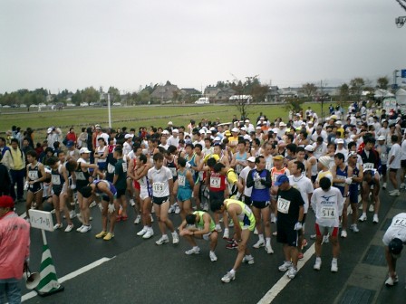 ◆入善扇状地マラソン2003 (掲載が年末ぎりぎりですみません。 ) 朝、でかけるときはかなりの雨でしたが、アップしている頃には雨もなく毎度のことながら 天気に強い我々でありました。 初レースのミチオさん、初ハーフのラガーマンさんともにすばらしい記録でありました。 Sさんはしっかりと自己記録を更新、Fさんは発熱の余韻にもかかわらず好タイムでした。 kobaは、10kmに変更してトライしました。ハーフのスタート直前です。