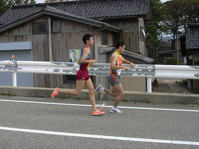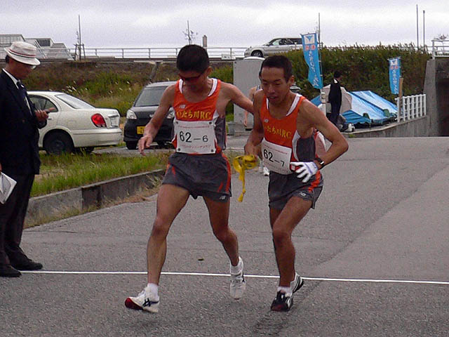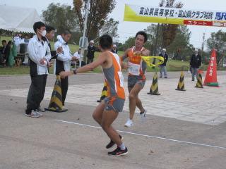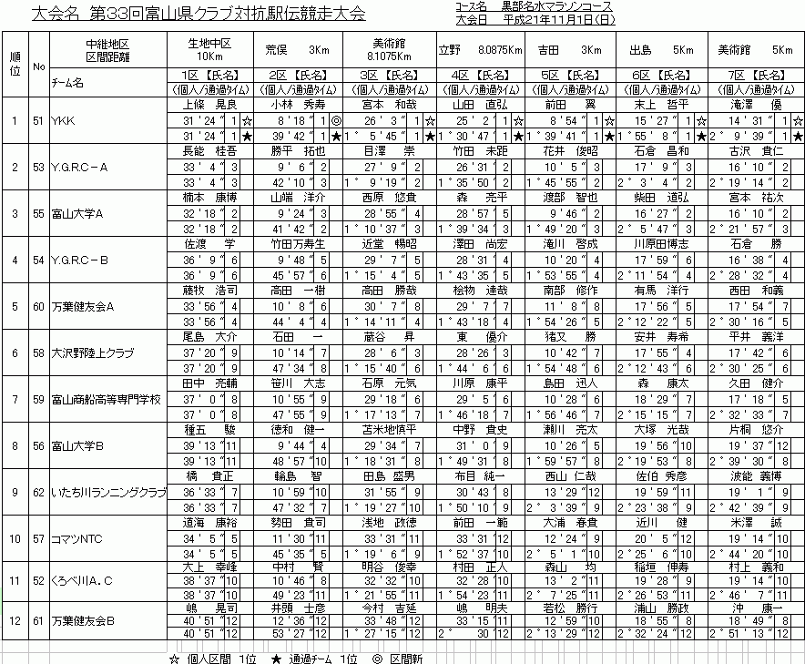 Gallery part 26 ◆第33回富山県クラブ対抗駅伝競走大会(2009年11月1日 ) 都大路を目指す全国高校駅伝競争大会県予選と同時開催の伝統ある県クラブ対抗駅伝競争大会、何の因果か?誰が言い出したのか?、ファンランナーばかりの弱小クラブがこれに臨むことになってしまいました。しかも怪我人病人遅刻や休日出勤を一人も出せない補欠無しでのエントリー、当日までのイヤ当日までも相次ぐトラブル・・・前日封切の映画「風が強く吹いている」よりもコミカルなドラマの様でしたが、7名で何とか最後まで襷を繋ぎ切りました。O監督、そして応援に黒部まで来ていただいたKさん、TETEさん、Fuさん、JNさん奥様、sakuraさん、yoshieさん、海苔Pさん、見送って頂いたテラさん&ももちゃん他みなさま、そして大会運営に関わられた皆様、ありがとうございました。